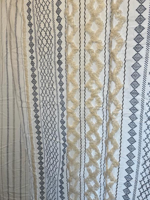 The design is definitely stylish and adds a nice touch to the bathroom, but the material is on the thinner side. Right after hanging it up, I noticed the textured part was already starting to get loose threads and snagging, which was disappointing. The water resistance has actually been great so far — even with daily use of the shower and bathtub, it pulls back easily and holds up well in terms of keeping water where it belongs. However, installation was a bit tricky. Because it’s fabric and needed to be paired with the plastic liner I already had on my shower rod, getting it hung up properly wasn’t the easiest process. Overall, it looks nice and functions decently, but I’m unsure how long it will hold up with wear.