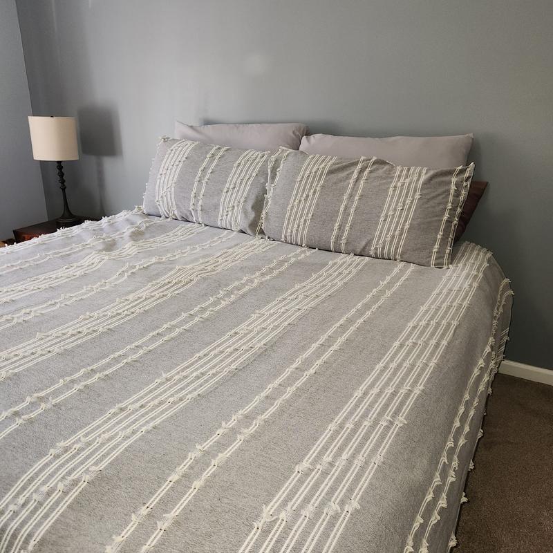 I love this duvet because it has texture on one side, and the other side is a pattern. Too many duvets are plain and bland. The material is soft and snuggly, not scratchy at all. It washes up well in our home washer. No shrinkage. And it fits our Cal King comforter perfectly.