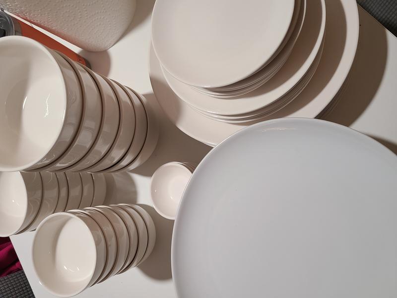 Perfect white plates and bowls. My husband loves the small bowls for small snacks. I love the smallest bowls as prep bowls. The set is sturdy, dishwasher strong and perfect for casual and formal dining. I purchased device for 12 and am pleased. I would recommend the dishes.