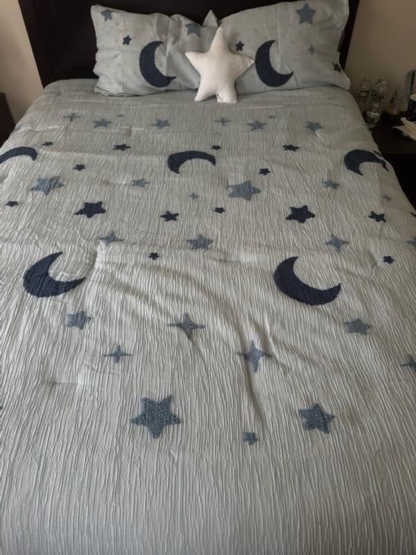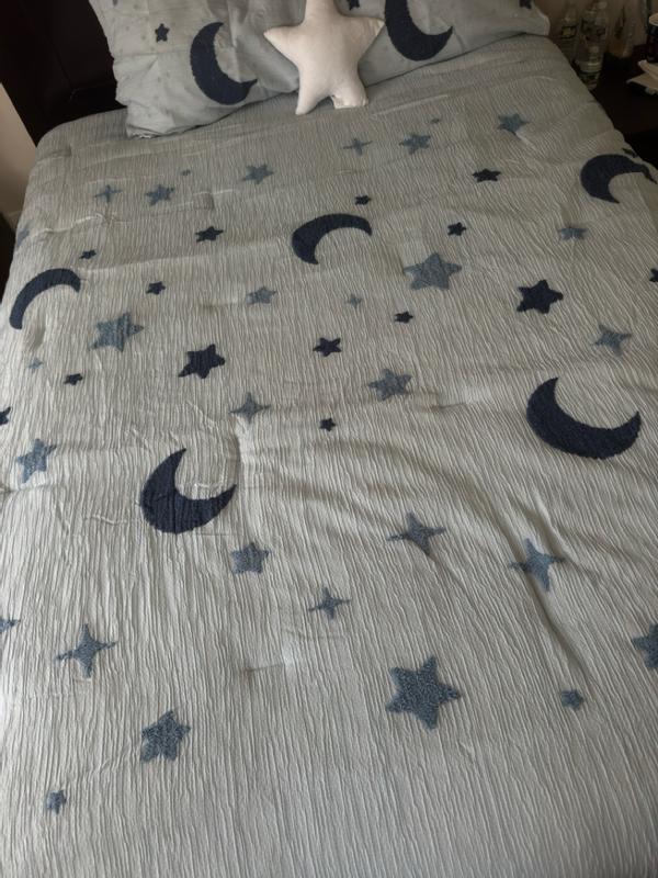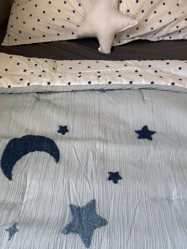 Adorable and super comfy! The light blue color with the star pattern looks even better in person-so calming and perfect for my kid's room. It's soft, lightweight, and cozy.My little one loves it. I highly recommend it for any kid.