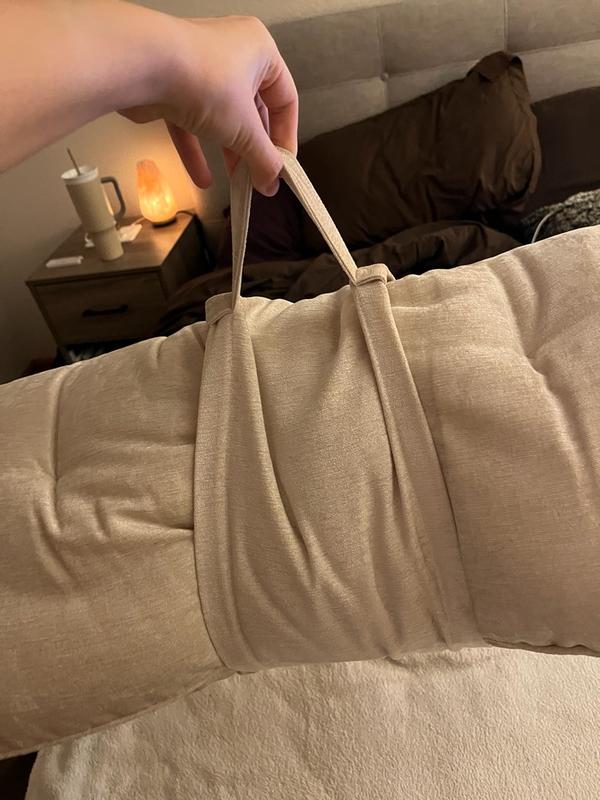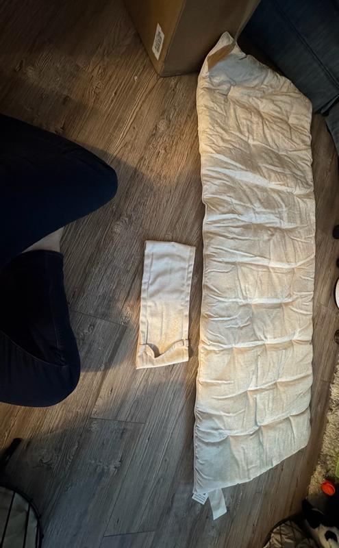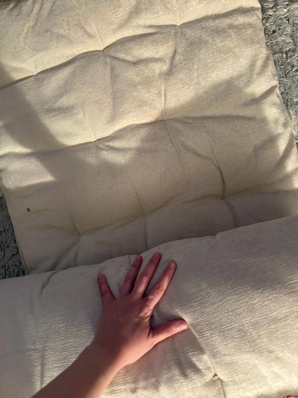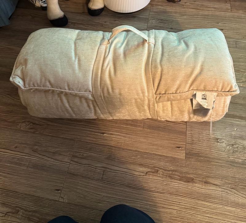 I want to start with the positives. The fabric is soft and luxurious. It’s a very nice texture. The size is large enough for two kids or an average adult to lay out on. I also love that it comes with a carry handle, I wish they had attached it so you didn’t lose the strap, but not a big deal. The con… this is extremely thin. The photos make it appear to be able to prop up in a more sturdy manner than it is. If it’s on hardwood you will feel the floor below you. It’s definitely more to bolster an existing cushion or as a bench cushion or to lean on a wall. As a floor lounger, I’d want more support. It’s not lumpy, but I wish they had given it a little more stuffing!