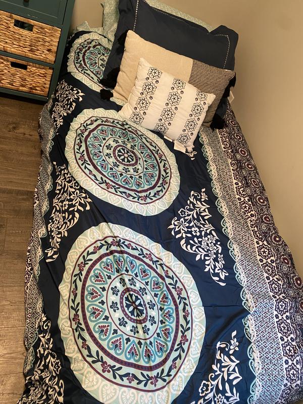 The Intelligent Design Loretta Boho Comforter Set with Bed Sheets is a delightful addition to any bedroom. As someone who values both style and comfort, I've been thoroughly impressed by this set. First and foremost, the Boho design is stunning. The combination of vibrant colors and intricate patterns creates a visually appealing and trendy look that instantly transforms the bedroom. It's a breath of fresh air compared to plain, generic bedding. Beyond aesthetics, the comforter itself is cozy and warm, ideal for a good night's sleep. The included bed sheets and pillowcases are soft to the touch, adding an extra layer of comfort. The entire set is easy to care for, machine-washable and retains its colors and quality after multiple washes, which is a big plus for busy lifestyles. One standout feature is the attention to detail in the stitching and craftsmanship. I appreciate the durable construction, which ensures that this set will last for a long time. What truly makes this set a great value is that it includes everything you need for a well-coordinated bed makeover. You get the comforter, two shams, a flat sheet, a fitted sheet, and two pillowcases, providing excellent bang for your buck. Whether you're looking to revamp your bedroom or simply want a fresh, stylish bedding set, the Intelligent Design Loretta Boho Comforter Set with Bed Sheets is a fantastic choice. It seamlessly combines aesthetics, comfort, and quality, making it a standout in the world of bedding. I couldn't be happier with my purchase.
