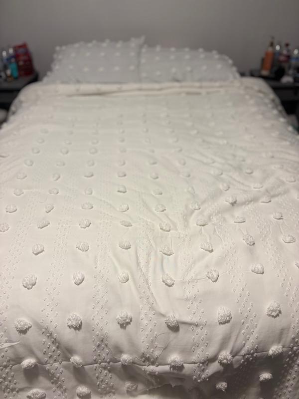 Dear customer, thank you for your feedback. While we're glad you found the set comfortable, we’re sorry to hear it didn’t fully meet your expectations. The Lucy Clip Jacquard Comforter Set is designed to bring both style and comfort to your space, with its playful pompom details, hypoallergenic fill, and OEKO-TEX certified materials. Because the set arrives compressed for shipping efficiency, it may require fluffing and light steaming to restore its intended loft and texture. We appreciate you giving it a try, and we’re here if you need any guidance to help bring out the best in your new bedding.
