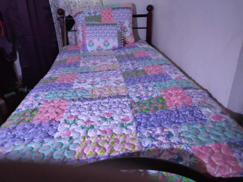 This is the coziest quilt very beautifully dressed with the matching mini pillow. It’s a size queen and I used it on my twin for my kids bed I like it to cover the sides so I sized up. Its design is unique for sure like a Spanish blanket with flowers and gentle designs. It came in a nice package no rips and no hanging threads. It’s easy to assemble I’m having fun with this quilt.