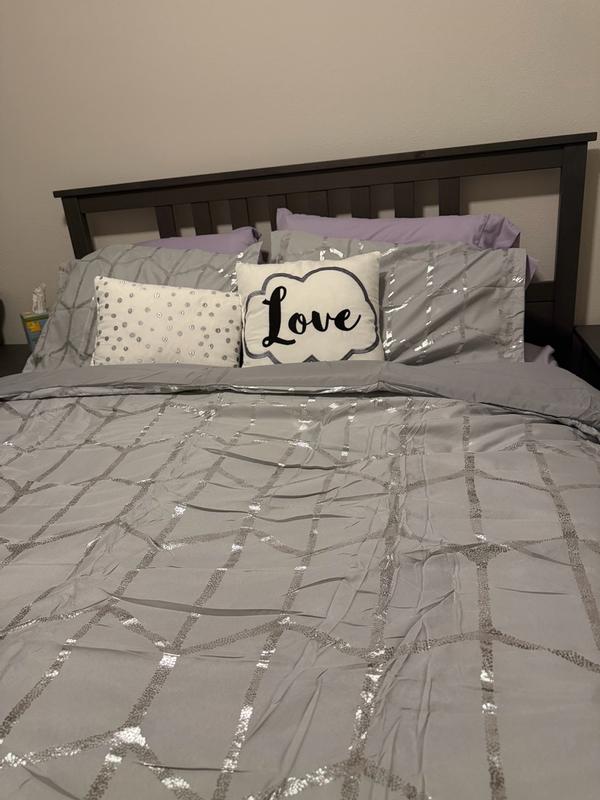 I love this comforter set! It’s very pretty and shiny in person. I don’t know how to explain it, but this is literally the perfect guest bedroom set. It makes the room look super elegant and beautiful. The set came packed super well, with the comforter, 2 shams, and 2 decorative pillows. Everything was great quality, and I like that the comfortable can be reversible as well. This is definitely going to be in our bed sheet rotation!