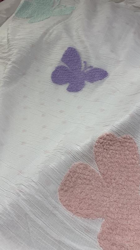 This butterfly bedding set is just beautiful! The top layer is muslin material so it is super soft and comfortable. My four year old daughter loves it and it makes her feel like a big girl!