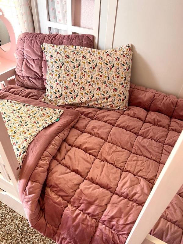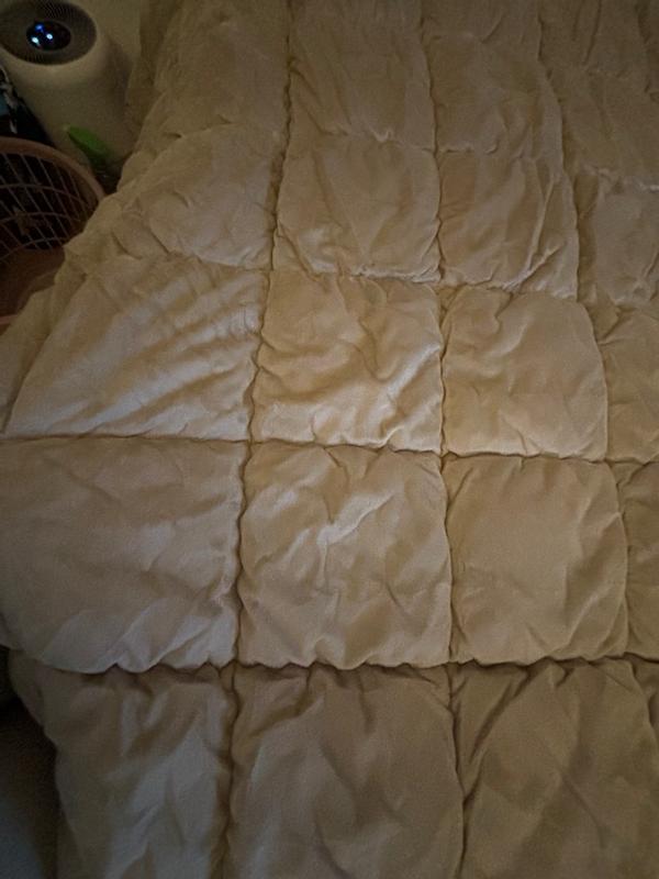 The Velvet Dream Puff comforter set is so NICE! The top side is plush and velvety. Then the underside is soft cotton. It is fluffy like a down comforter but has a lot of weight to it. It is so soft and perfect for the cooler months.