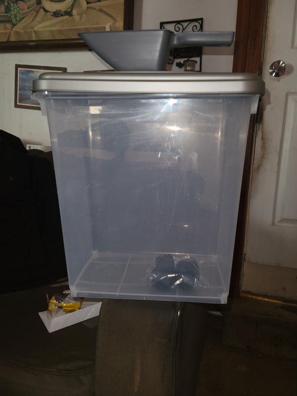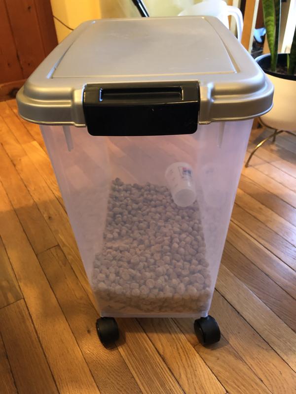 Now I know this air tight pet food container is for food, but when I bought it I got it for a specific idea and it works great!!!! My kitty litter i put in the air tight storage container it keeps all the moisture out of it, it came with a measuring scoop which is so convenient. The air tight pet food container is so worth it you can store anything you want it comes on wheels makes it easy to get around, its 33 gallon so plenty of space, it's air tight, and made of very sturdy plastic it's nice and heavy you will love it. I highly recommend it this container.