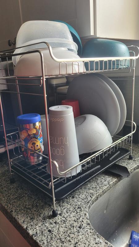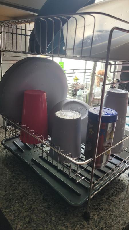 This 2 tier dish rack has been a lifesaver for me! I highly recommend it! It was great to use over Thanksgiving as it did not take up too much space on the counter and I was able to dry more dishes in less time! The slide out drain tray makes it so easy to clean which is a boon any time!
