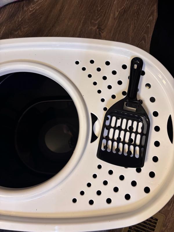 I think this is a great litter box for keeping floors clean! Really no mess left behind by cats and as long as they’re in decent physical condition, I don’t think they mind the top entry. May not be ideal for larger cats though. Overall, I think the quality is good and users will have an easier time keeping the house floors much cleaner. This litter box comes with a good scooper that can hang on the edge of the box.