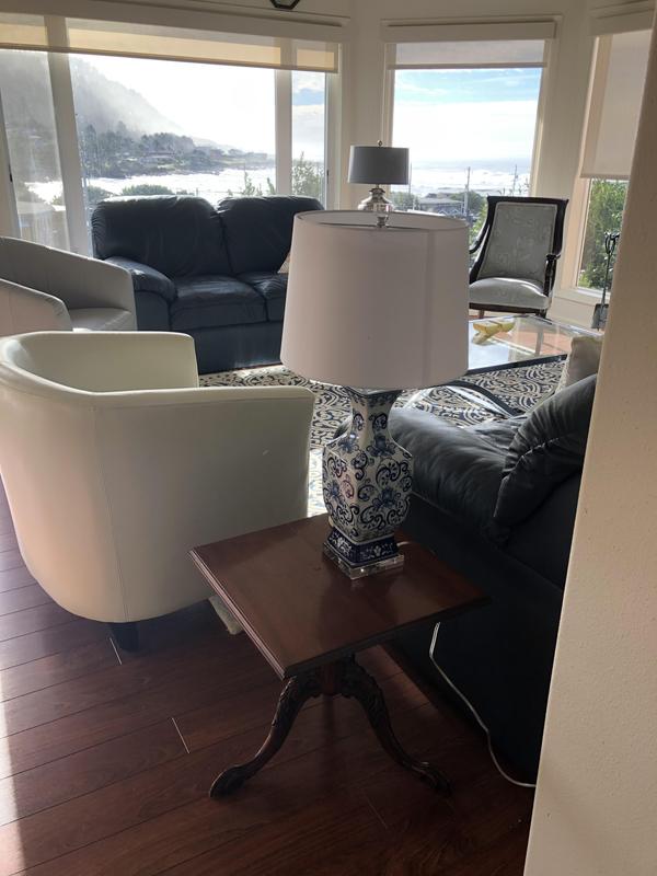 Love this beautiful, well made lamp in which the shade is in perfect proportion to the base. Love the vivid blue and white/ivory color and the crystal at the top and bottom of the base. Arrived in perfect condition and in a timely manner. Would purchase again!