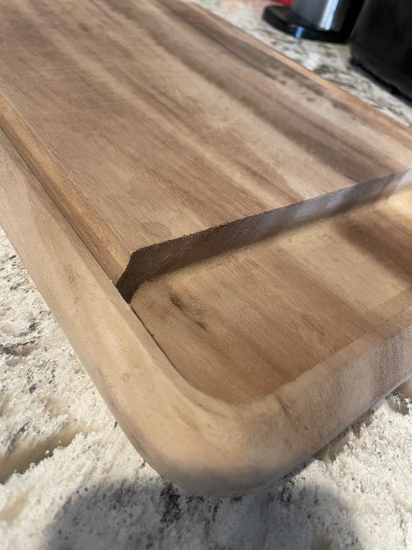 The acacia wood has a beautiful grain giving this cutting board a high-end look and the 10.5"x15" size is perfect for small jobs or daily use so this cutting board has earned a permanent place on my countertop. The grooves along either side slant into the larger cavity to easily drain away any juices and the cavity is perfect for collecting scraps as you cut. It really cuts down on the mess and the large, deep channel makes it easy to empty into the trash without any drips or messes. The bottom does have rubber pads on the underside corners to keep it from slipping or damaging surfaces. The wood is easy to maintain with a simple wash, air dry, and occasional oiling as needed and I do like that the care instructions are underneath on the tag in case it's gifted.