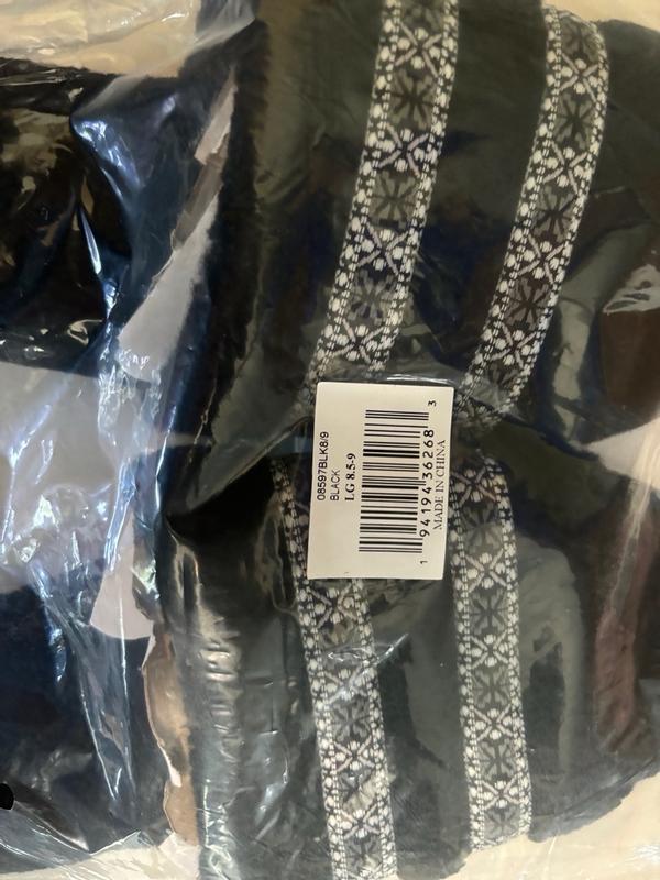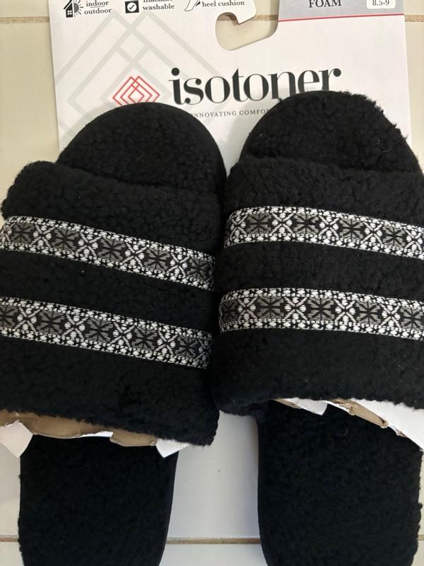 These slippers are very cute but the sizing is inconsistent. The left slipper is so wide that my foot slides forward & my toes hong out the front! The right slipper fits a little more snug but I fear it may stretch out too much. Furthermore my right foot is a little larger than the left foot, & it's a slightly swollen from knee surgery. If anything, the left foot should be the one sliding off. I regret that I must return them. The other style of Isotoner slippers I bought at the same time were perfect!
