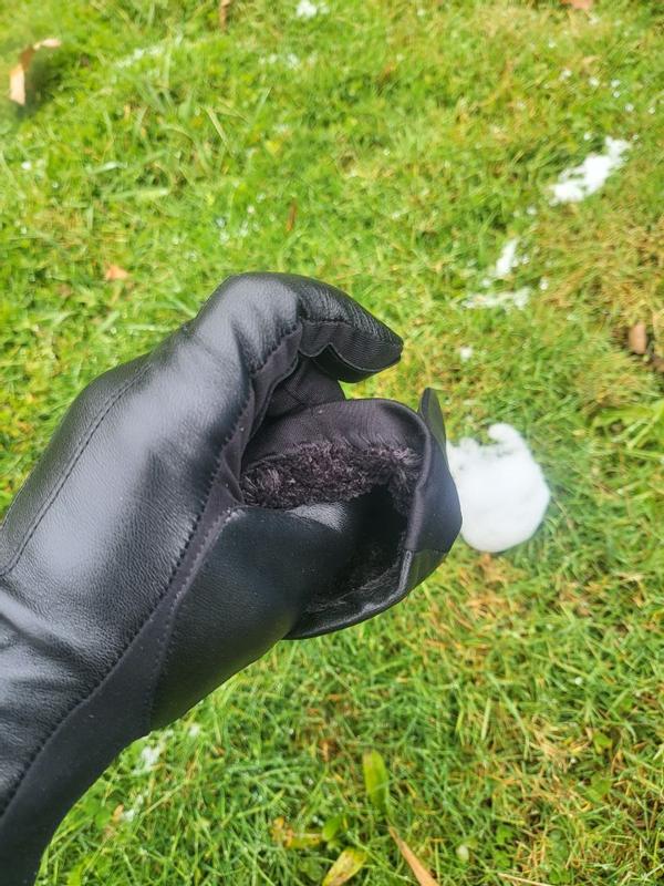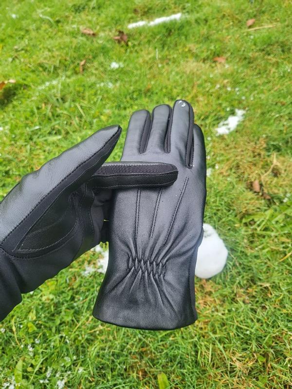 I'm really happy I received these gloves. They feel nice inside and out. The exterior is leather on top with a stretchable fabric on the bottom. They also have a touchscreen compatible fingertip that works just fine on my phone. The interior has a plush material that feels fuzzy and cozy. I received the small/medium size and they fit my average size hand. I also appreciate the gathered section on the wrist as I live in a cold, windy climate during the winter and that will really keep the cold air out. Overall they seem like a high quality glove that looks great and should keep me nice and warm. Would probably make a nice gift for someone too.