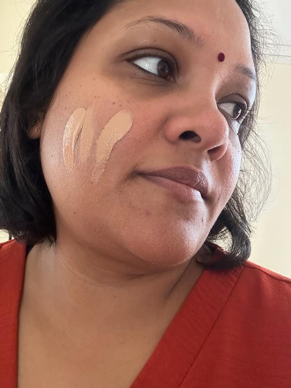 The foundation has a great coverage without feeling and looking cakey. It’s smooth and I love the natural glow. I love that it has skincare and sun protection. It still looks good after 6 hours. It’s lightweight and makes my skin glow naturally.
