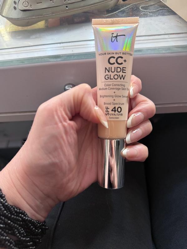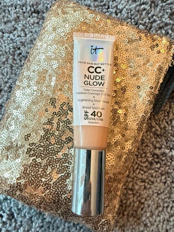 I have used and loved It cosmetics for years. Primarily the CC foundations. This is a great size for the value for the size. This has a medium-buildable coverage, with a dewy finish. This nude glow lightweight feels and smells like chemical sunscreen in my opinion. My least favorite of all of the cc creams I have tried. If they were able to make this scent free I would love it more!