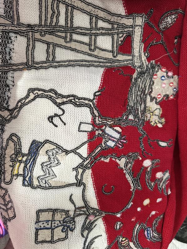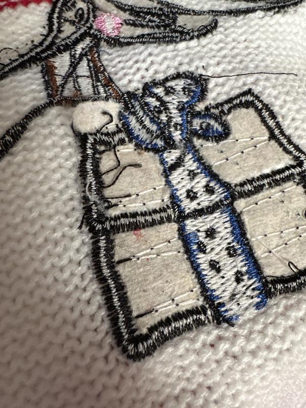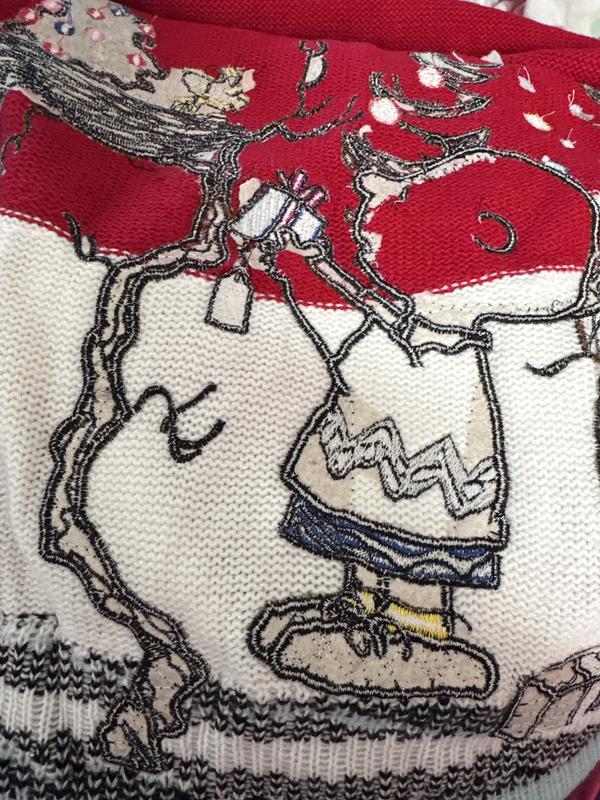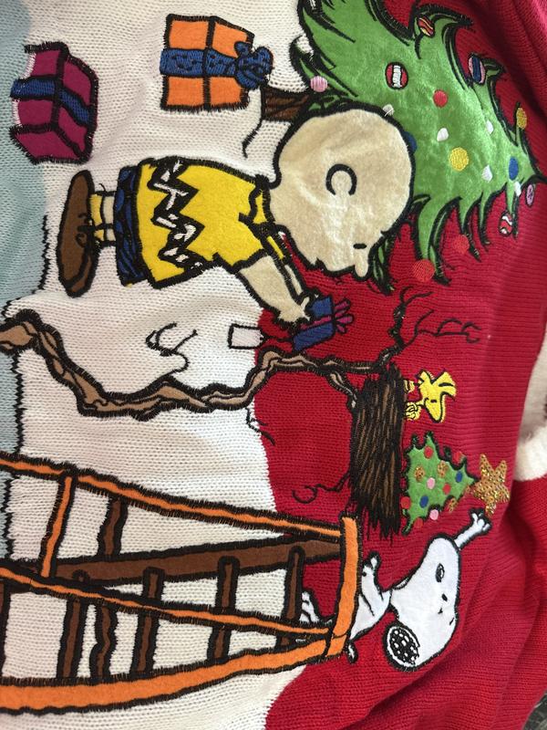 I wish I could have loved this sweater but alas I cannot. The white fuzzy trim is incredibly soft but the sweater material feels scratchy in comparison. Also the picture of the characters that is beautiful. Bright and colorful and adorable. Unfortunately if you flip the sweater inside out, you can see the back stitching and the panel where the stitching is , is completely bulky scratchy and uncomfortable. Normally a padded material is sewn on the inside of the sweater with a soft material so that you don’t feel that scratching backing. This sweater is missing the protective layer and thus will scrape and scratch the chest. So you have to wear another shirt underneath to protect your chest from being scratched but in doing so, the shirt you wear underneath will be damaged from the scraping and scratching of the snoopy Charlie Brown patch against your shirt. Obviously a design or production flaw. So the sweater is beautiful to look at but extremely uncomfortable to wear. I ordered it online not in the store. So I didn’t know how uncomfortable it is to wear. I would not have purchased it otherwise. I have lost the receipt and took off and threw away the tags before I wore it, so I can’t return it. Such a shame. It is truly a beautiful looking sweater. I am sad it turned out this way.