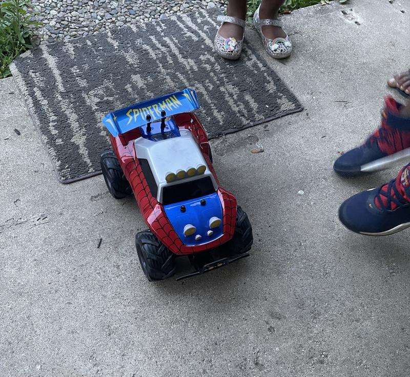 This remote car is a great size and it has a long range. My son loves Spiderman and wants to take this outside everyday to play. The vehicles drives easily over grass and concrete and it goes at a fast pace.