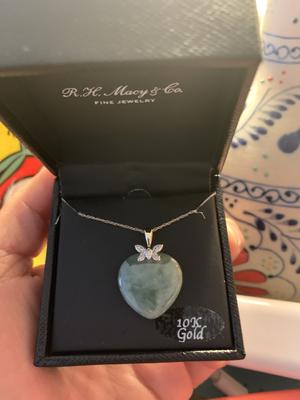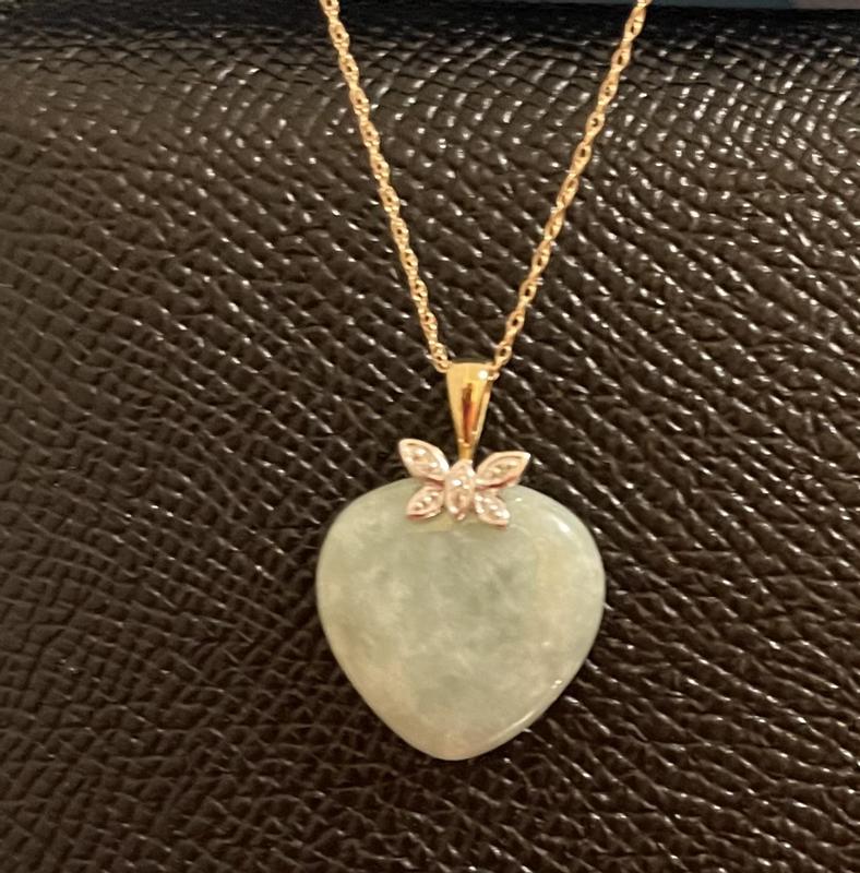 The Jade heart is very beautiful and the diamond butterfly makes it look so elegant. The thin necklace adds to the charm. It was a great anniversary present, my husband has yet to disappoint 😊😍