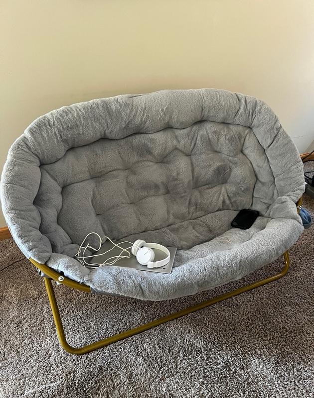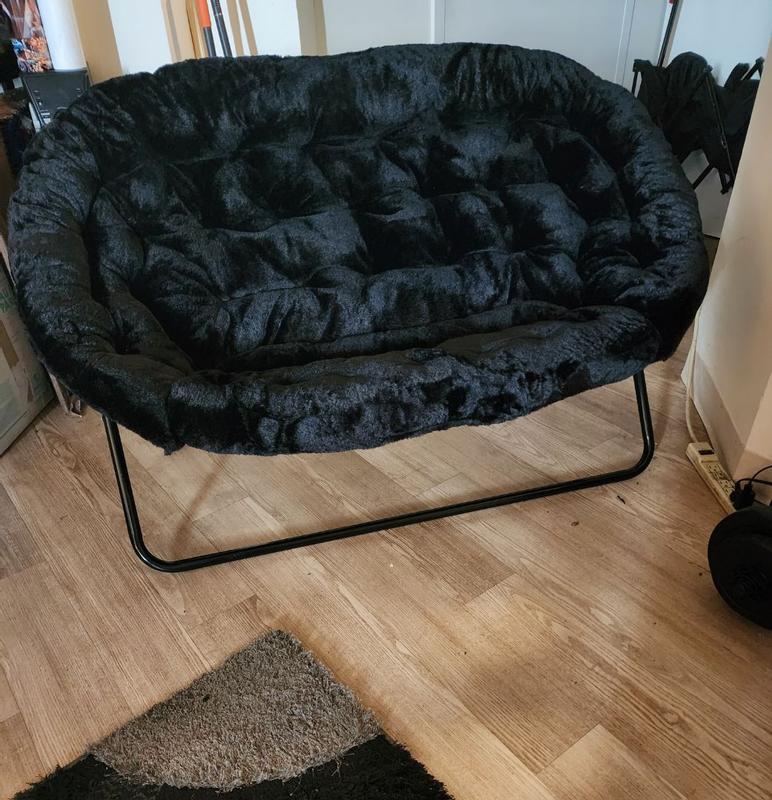 This comfy chair is so huge. I love that you can fold it up for the convenience. The material on it is very soft and fur like. Goes perfect in a bedroom!