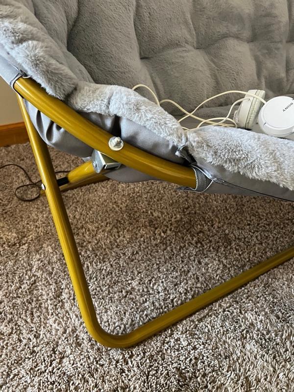 My son and I just LOVE this chair! This chair is very comfortable and perfect for two people. The assembly was pretty easy and quick. You just extend the chair and make sure the legs pop into the holes. And I love the fact this chair is white with gold accents 🫶🏼