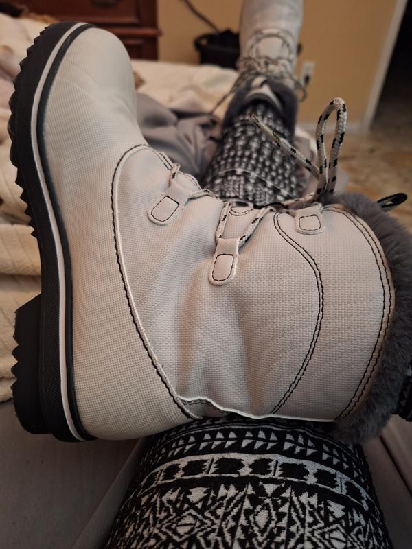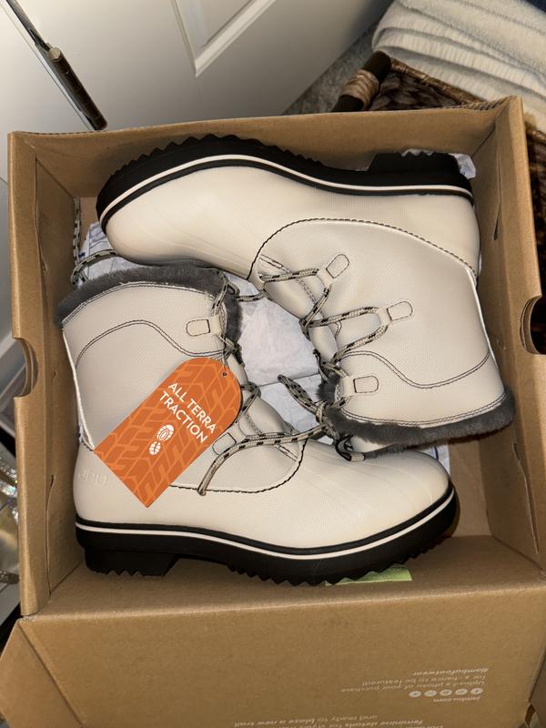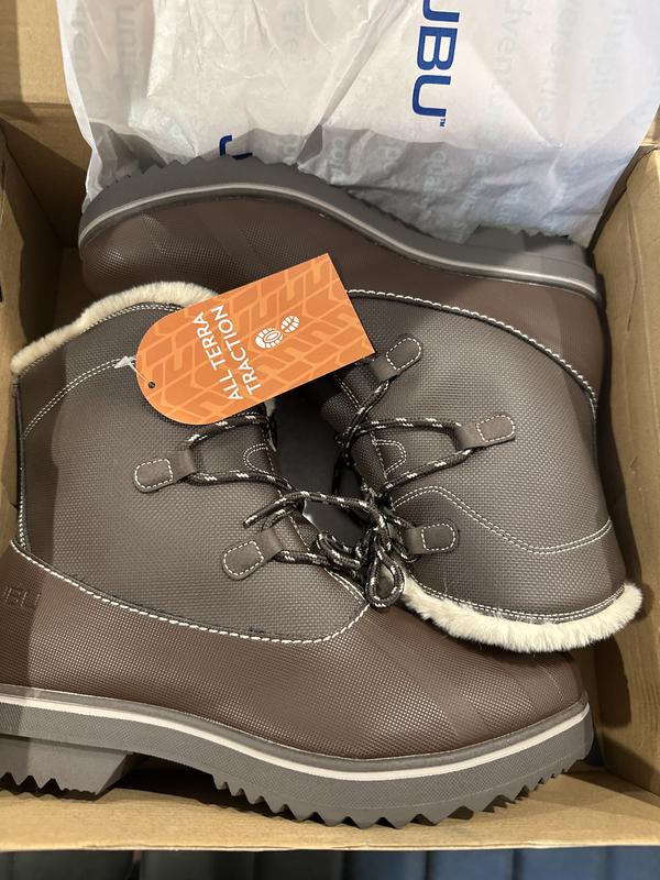 Bought these boots for Alaska. I live in Hawaii. So far it has good traction. Kept my feet warm annd dry. And they’re cute. Only bad mark is they scuff fast with the dark sole. But I like the dark sole.