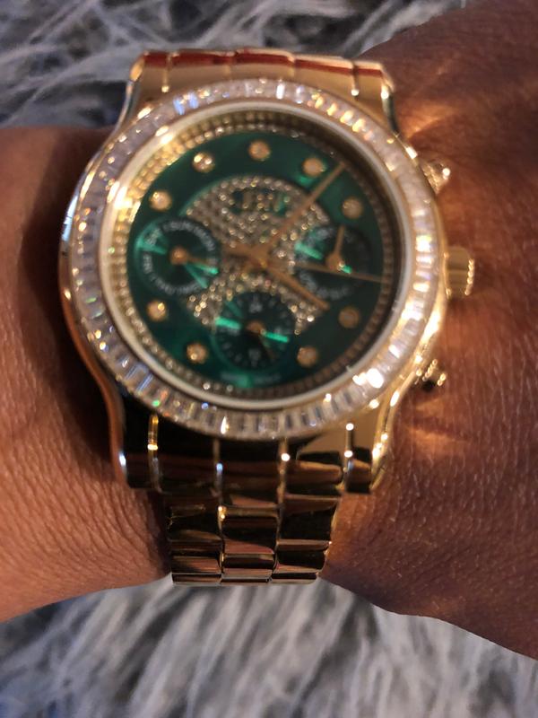 This watch is gorgeous! It has a sporty glam vibe. I've gotten nothing but rich vibes and complements from this watch. I have a wider wrist and this band fits perfectly (that was something I was worried about but fits amazing). This watch is an everyday glam, just what I was looking for (I have another watch that's just way too flashy for everyday) I can't say this watch is amazing enough a must buy. The diamonds are noticable! Not tiny at all, and the contrast of both silver and gold is a beautiful and necessary for those who like to wear both metals at the same time.