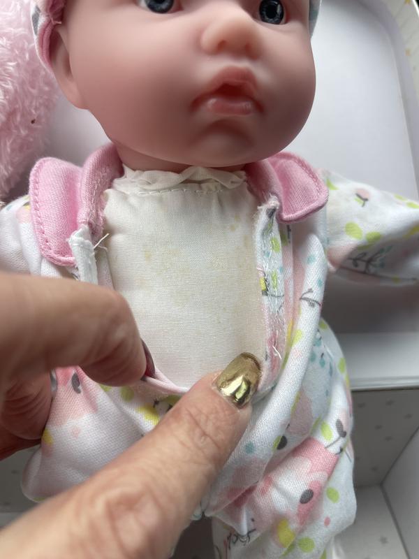 Purchased this gift for my almost 1 year old granddaughter for Christmas so cute, when they opened gift under the dolls clothes and on bunny was a moldy stain. I returned the item and purchased a new replacement, the same issue in the same spot. They came from Jctoys out of Miami. Where is your product control. What a waste of time. Very disappointed!