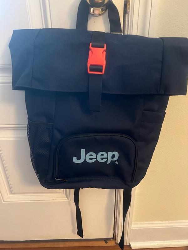 My husband really likes this Jeep roll top backpack. It’s big enough to fit a laptop and some books. It seems very durable. The straps are padded and comfortable. It even has a pocket on the side for a water bottle.