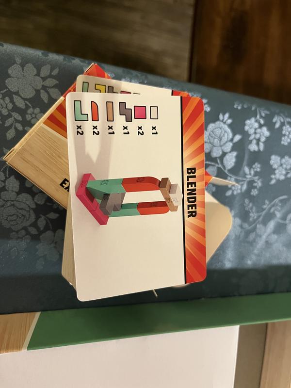 This game is like a no Jenga you have ever played. In fact it isn’t really like Jenga at all except for the stacking part. It is really good for communication building games. I thought a communications class for high schools and this game would have been a perfect activity for my curriculum! You have a picture that other person can’t see , then you have to tell them what to build! It is fun,and frustrating? Depends on listening skills of your partner and your description skill.