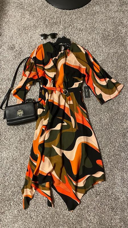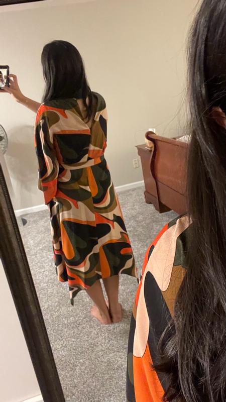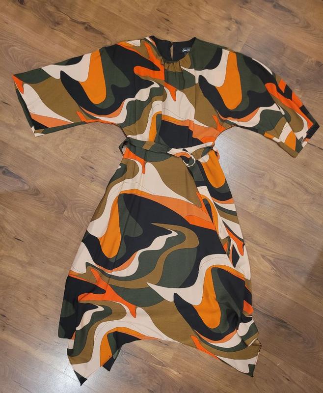 This dress is made of good quality material, you can tell it will withstand the test of time. I love the belt and gold buckle detail. Super fun print for a day out. It’s a more modern take on camo. Could be a great fall outfit as well. The size 6 fits me well (5’5”, 150 pounds for reference). Because of where the belt sits (just below the chest), it’s also very comfortable and is not restricting on the abdomen area. 4 stars only because I don’t love the neckline, I feel it makes the dress (or me in the dress) look older.