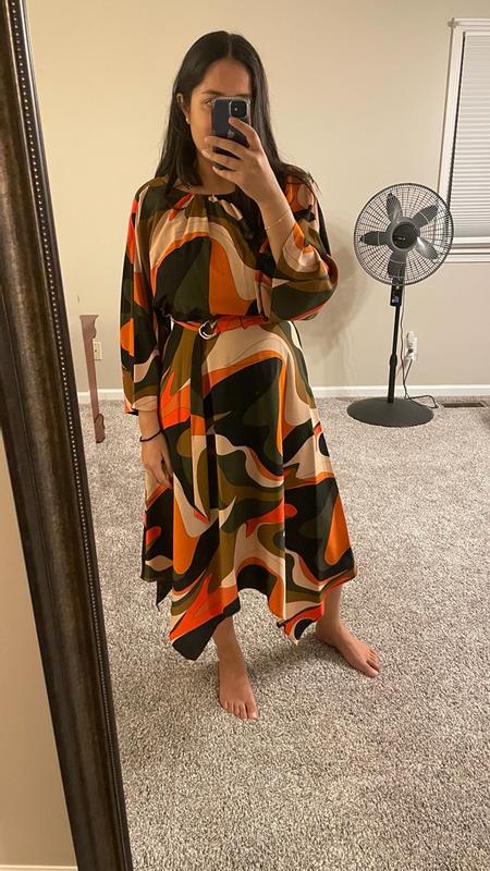The colors of this dress are perfect for fall. I have the size 2 dress, and it is a bit big on me, so I would definitely go smaller in sizing. The dress flows really nice and is really comfortable.