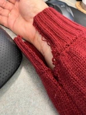 Love the sweater but the sleeve is unraveling as I wear it. It must have have been closed up on the stitching.