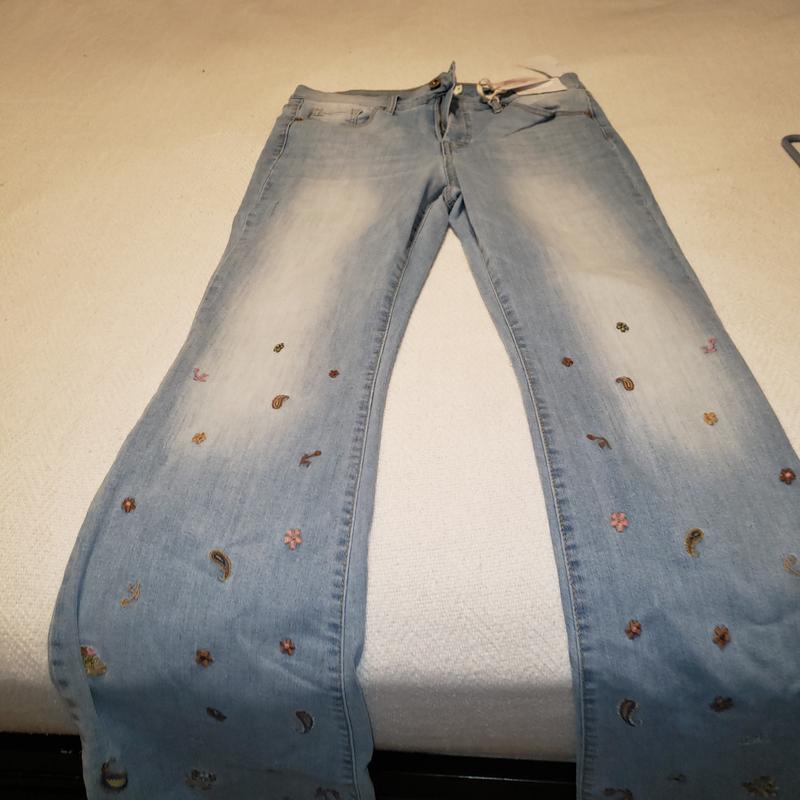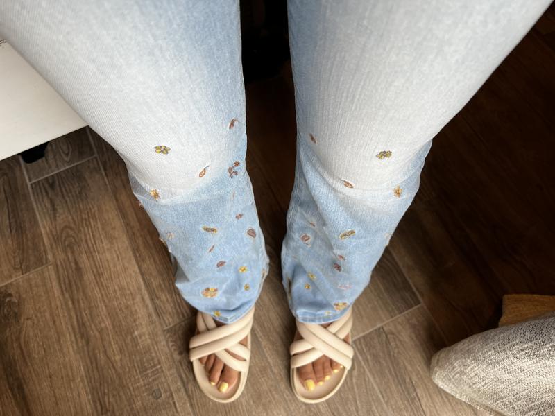 I love these jeans! The fit is great, they are stretchy and feel awesome to wear. The flare style with the embroidery is really cute. They look great with platform sandals and heels as well and flat sandals and shoes. Both my boyfriend and daughter gave me compliments on how good they look on me. They make me feel good when I wear them and I like wearing a new cute style of jean!