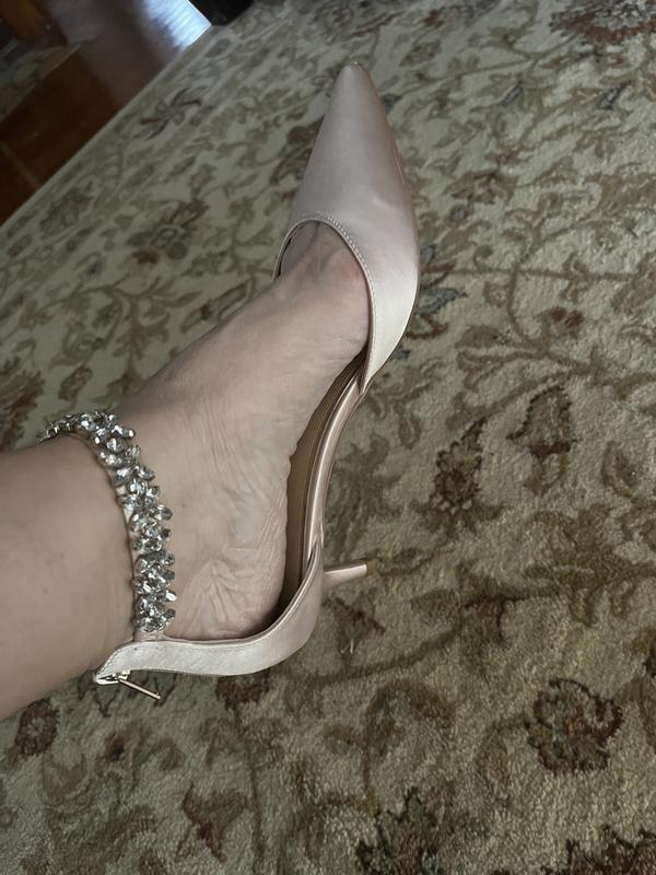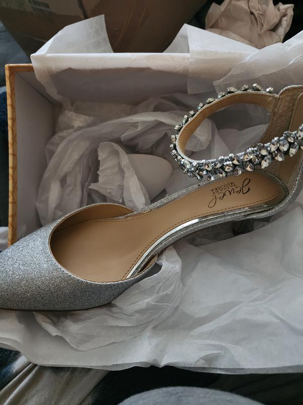 These are absolutely stunning shoes! The kitten heel is not too tall, and the glitter is not glued on. It is part of the shoe surface! The ankle jewels top off this pair of evening shoes beautifully!