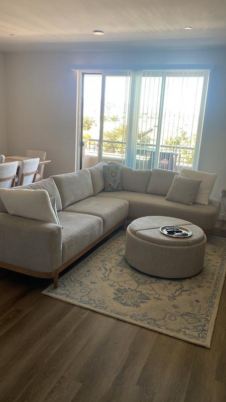 Bought this couch with the matching ottoman for our new home. It’s firm, yet comfy. Aesthetic and functional. Love the sand color - it looks gray on the website but it’s actually beige. Hopefully it holds up! We also got the worry no more protection plan because we have a baby. Delivery was fine.