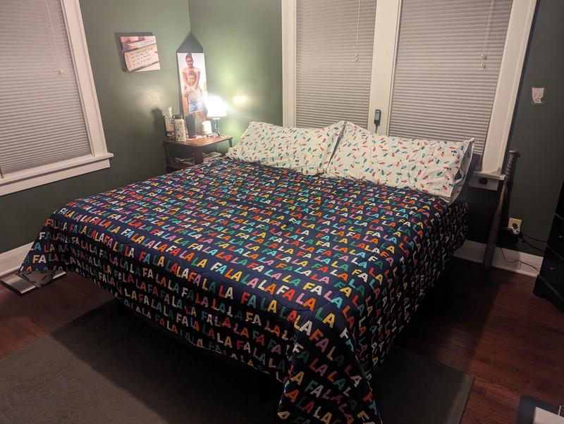 Got it for the little guy’s bed. It looks really good on a full-size bed. Material feels good to the touch!