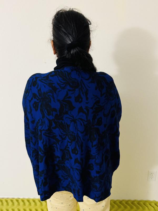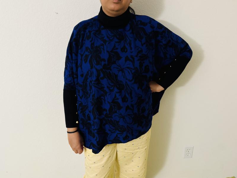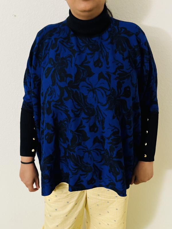 Blue sweater is comfy and warm. Its a mixture of style with keeping you warm enough. Turtle neck is addition to this beautiful sweater with golden buttons on the sleeve. Cant wait to wear it with legging and being trendy.