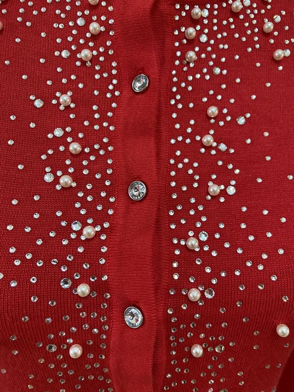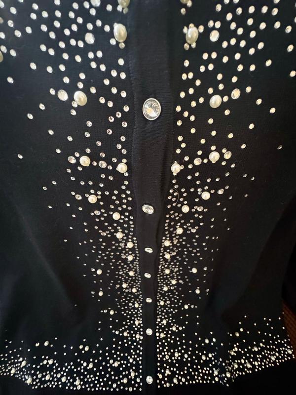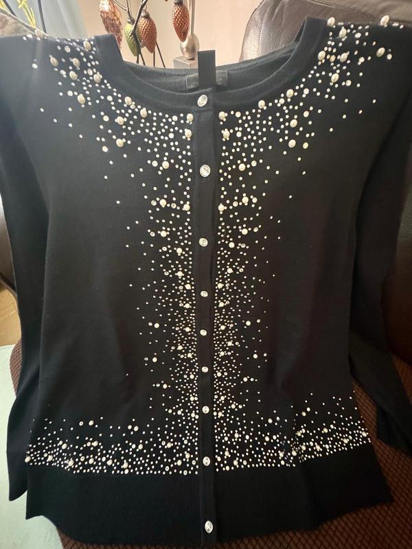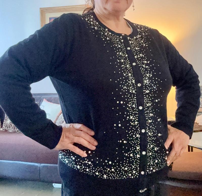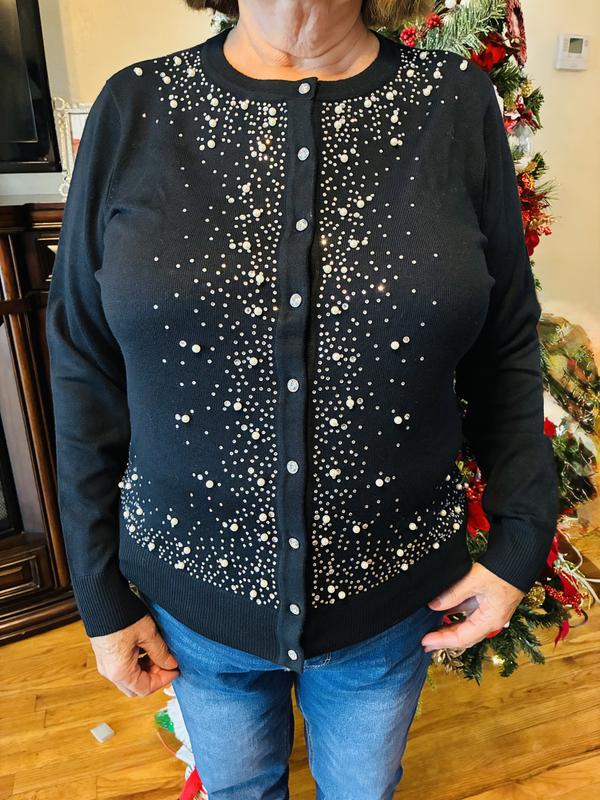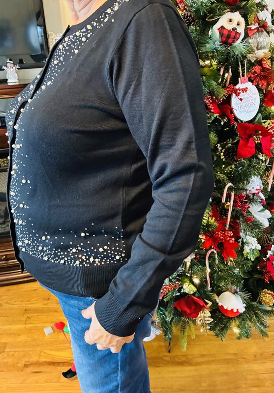 True to size cardigan that is soft, sparkly, and great for the holiday season. It only came in black at my Macy’s, so it would have been nice to see it in real time at the store in red. I love the black though!