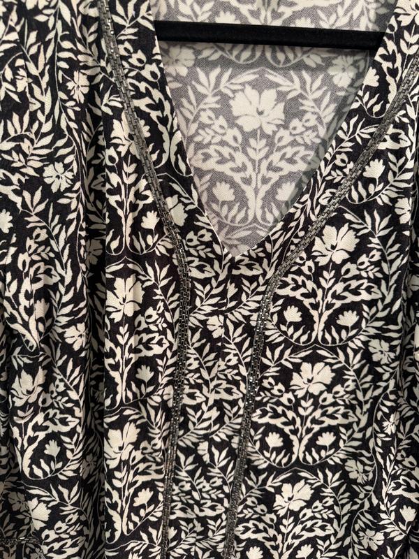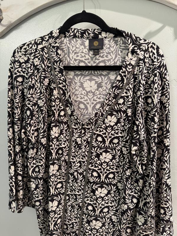 This top is perfect for this in between season weather. I love the embellishments, and it has a nice drapey fabric, which is really flattering. I love the bell style sleeves. I would say it is a little oversize so keep that in mind when ordering. Overall I’m completely happy with this .