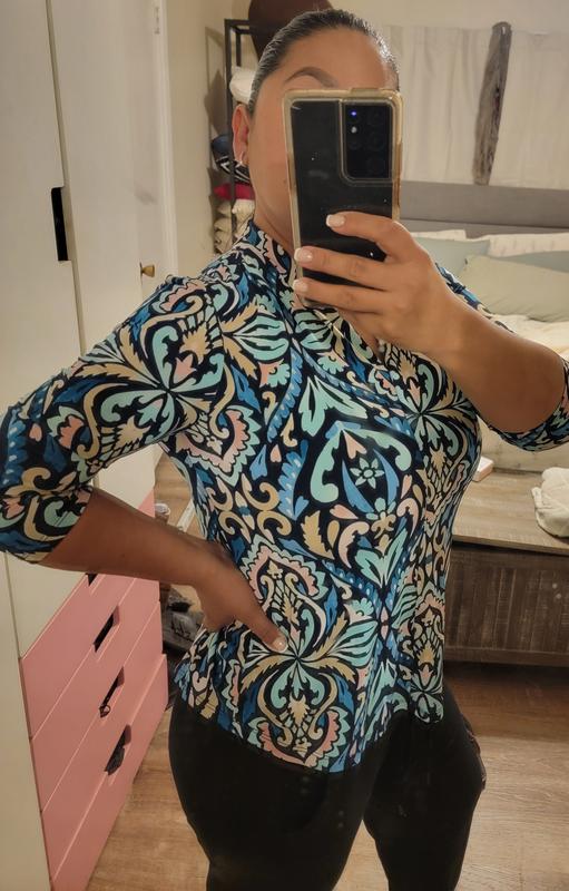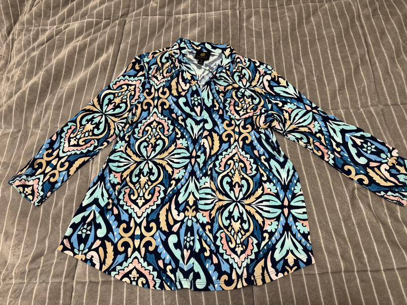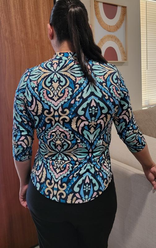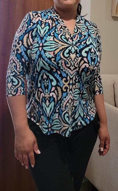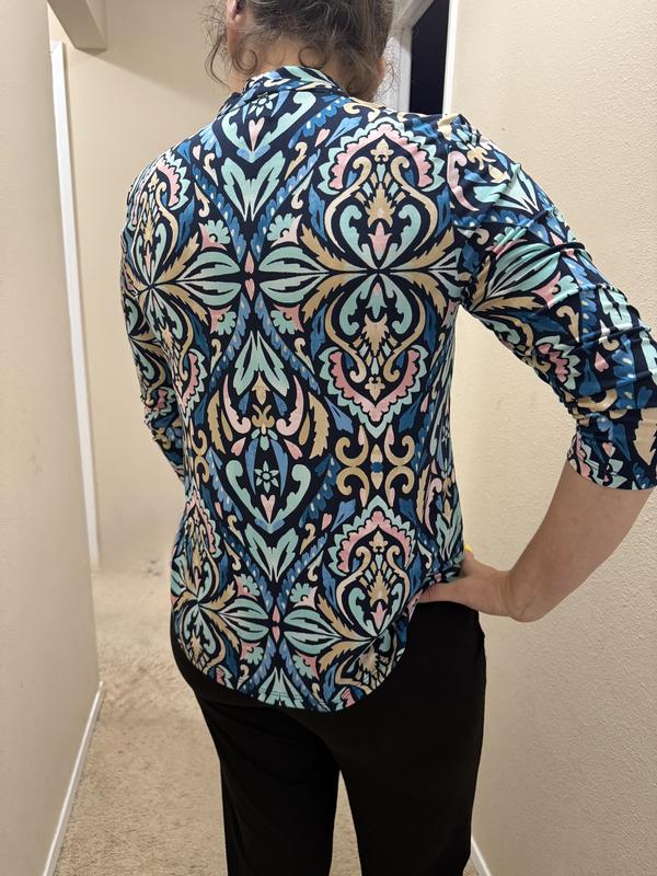 I really love this blouse because it has a pretty and colorful pattern.The fabric is light and feels comfortable perfect to wear all year long.The fit is very flattering and gives me a nice shape. Im 5'3 and 158 lb