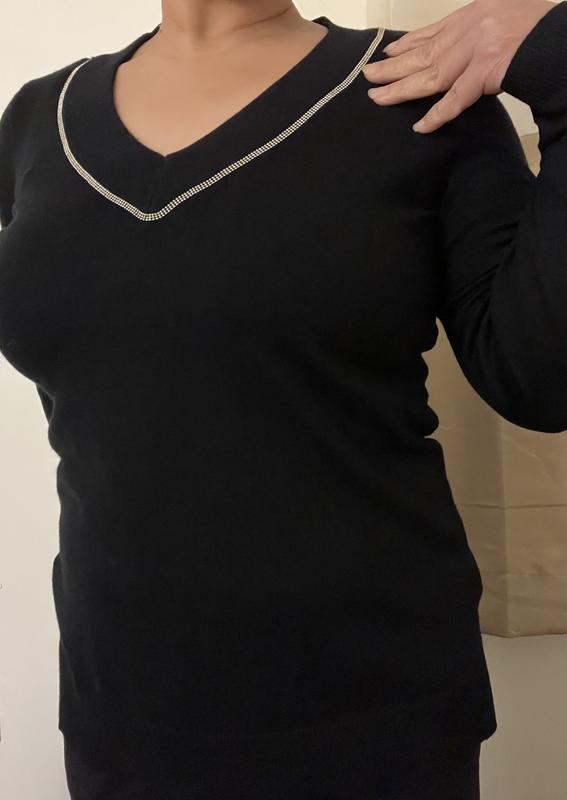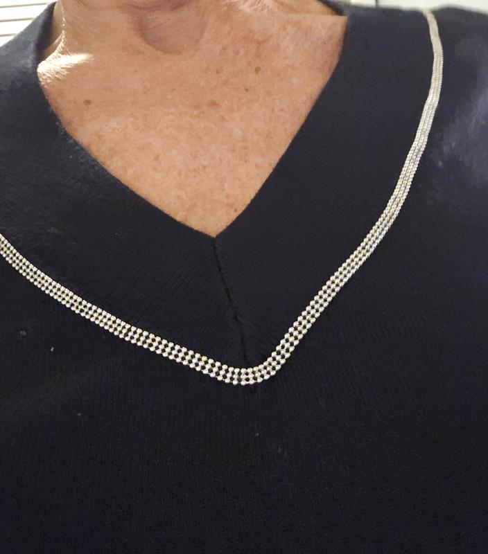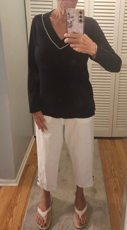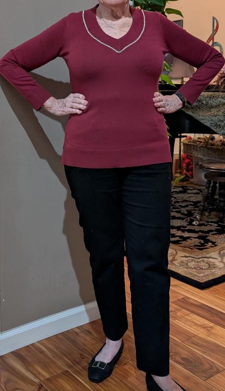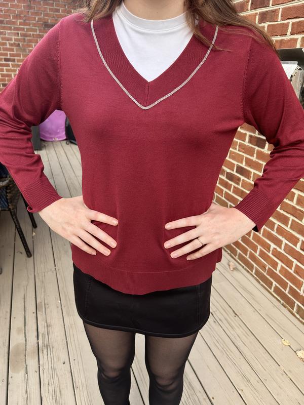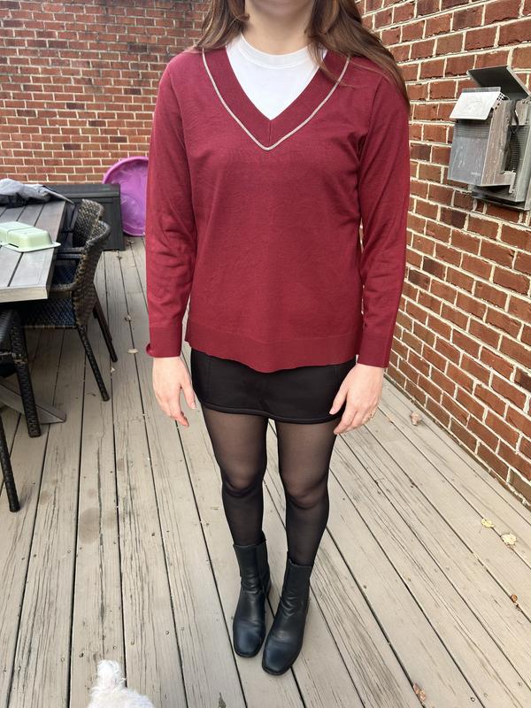 This is a soft, elegant sweater that is just dressy enough for holiday parties but not too dressy to wear everyday. I like the longer length and the v-neck. The beading is subtle. Pair with a black skirt or pants and you're ready to go