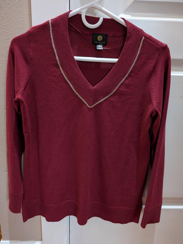 Absolutely love this dark red sweater! It is lightweight and stretchy. The detail at the neckline is beautiful but sturdy. The length is perfect to style with pants, jeans or skirts. I am 5'4", 153lbs, 34DD. I usually wear a medium in tops and got a medium petite because I didn't want it too long. I should have sized up to a large. It is too form fitting on me because I have a little tummy. Otherwise, such a beautiful sweater!!