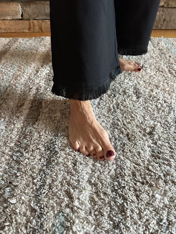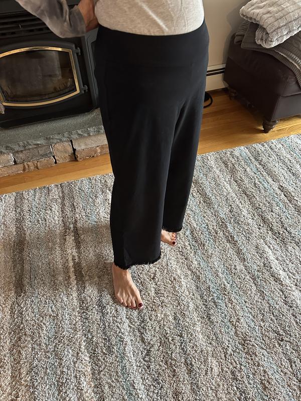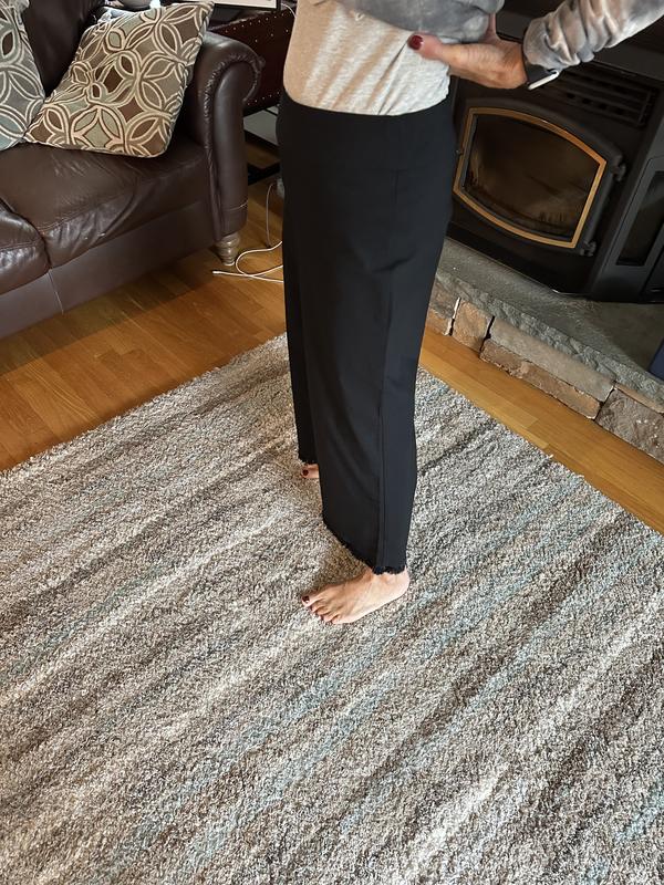 Nice comfortable stretchy fabric and the length was good, not capri length, but down to my ankles. For reference, I’m 5 feet 1 inch tall. What I didn’t like is that they’re too wide and made me look heavier. Also, they make a swooshing noise when walking. I love the comfort and the fringe on the bottom, but not much else. I’m still on the fence about keeping them.