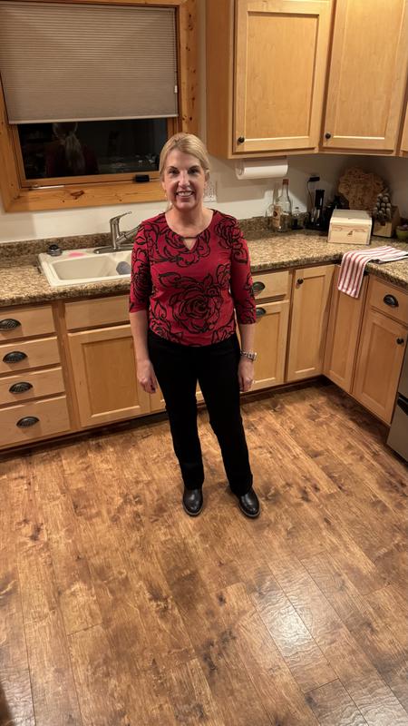 This shirt is surprisingly comfortable. I found the sizing to be true. It is easy to pair with black jeans or dress up with a skirt for a more formal look. The red color is vibrant and great for the holidays.