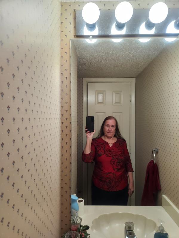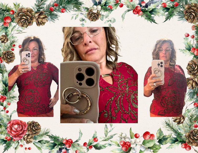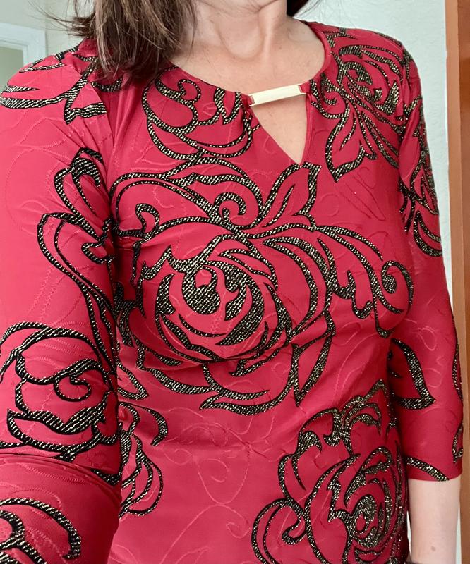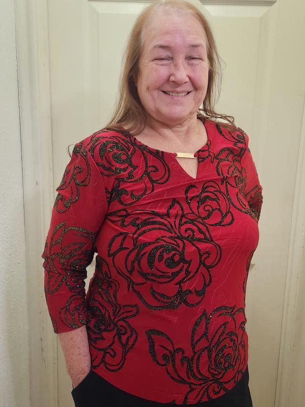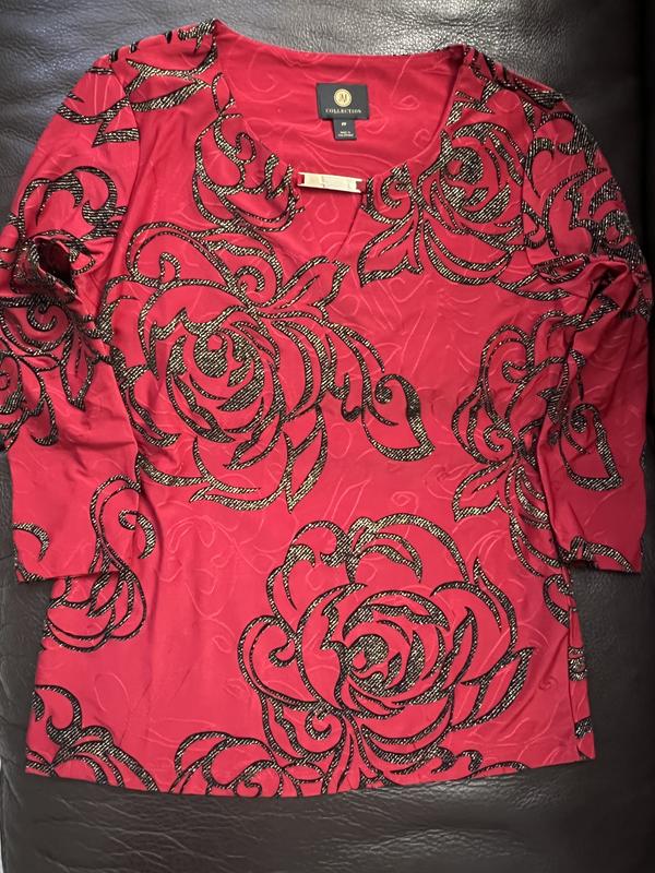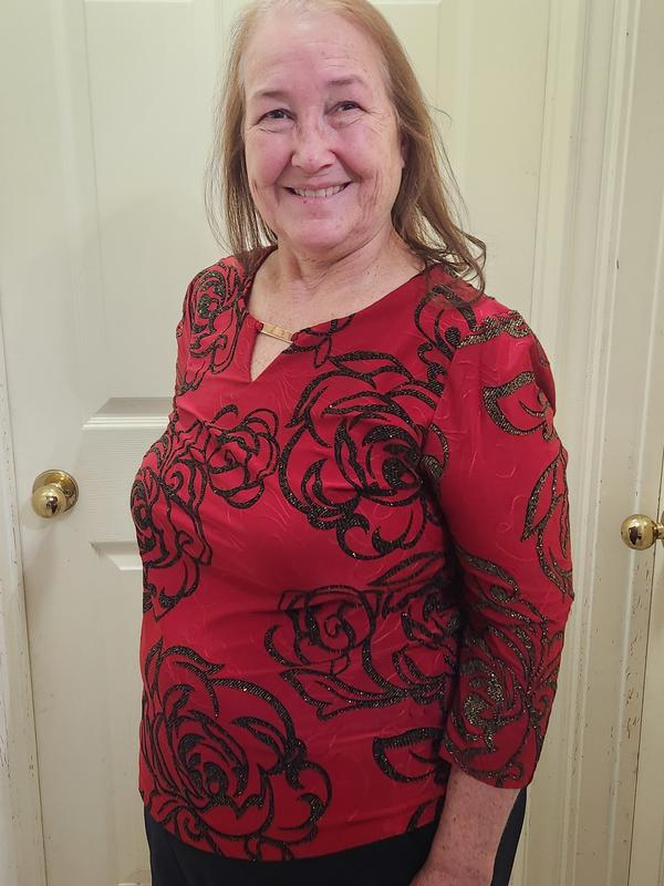This a very festive shirt for Christmas. Or any time you want to be a little more dressy. Perfect to wear on a cruise or holiday parties. The print had a glittery detail in black. The design was like a rose.