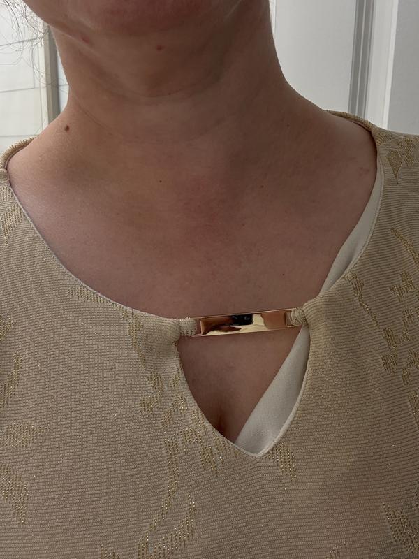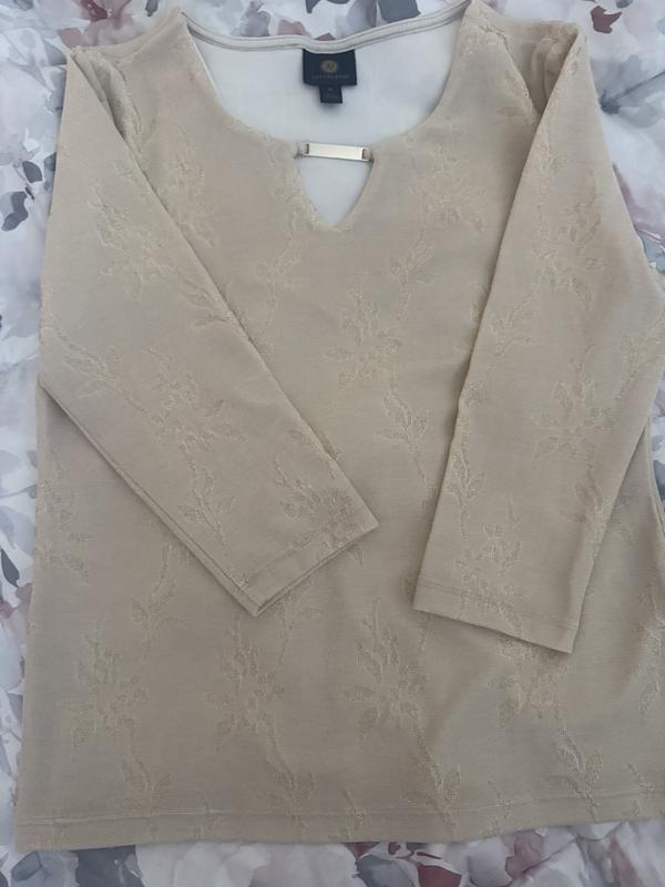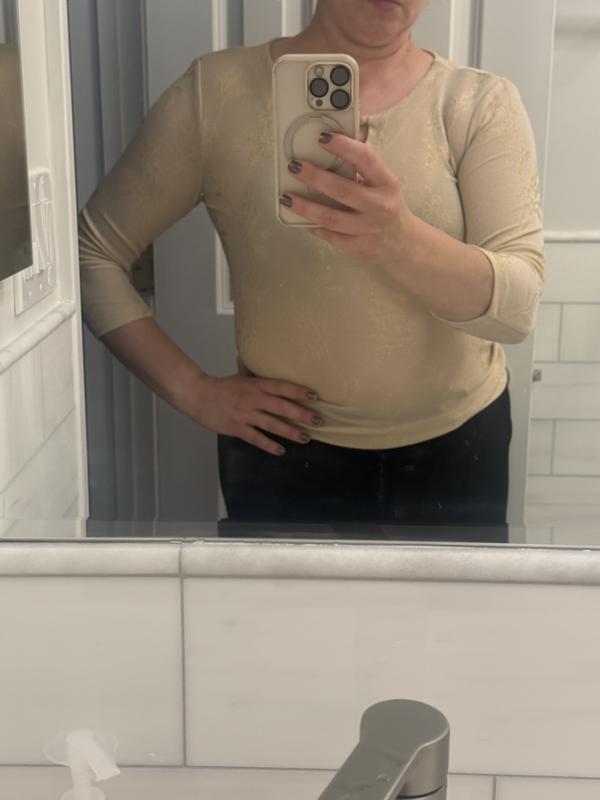Out of the package, I wasn't a fan. I thought it was a very aged look. My daughter even commented, "nope!" However, once I put it on, I could see how the gold sparkled and that the colors would go well with a pair of black slacks and blazer. The three quarter sleeves are perfectg for the petite girl! I did feel that although there is some stretch, it ran small.