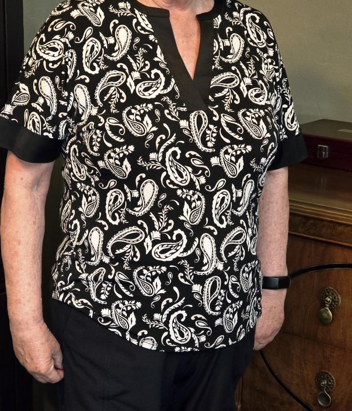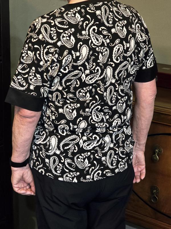 I have this in a petite small (I'm 5'4" 130 lbs, 34D). The fit is good. I'm not a fan of paisley or this color design. I do like the fit and the length of the sleeves. They are just right to cover my slightly aging arms now but not too long. The satin trim is pretty and the length of the top is perfect as well.