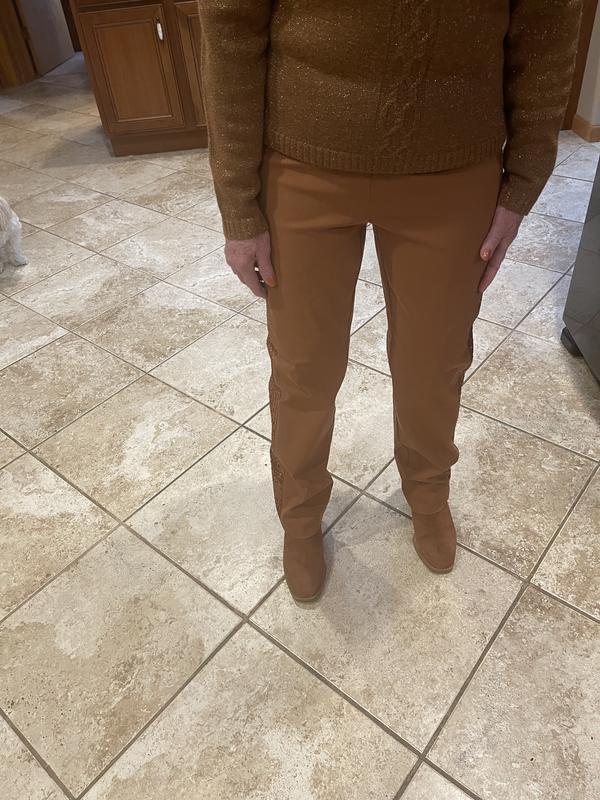 These pants have a stretch waist, pretty sequence down side of the pants the color seems to be more on orange not what I expected. They are comfortable and they were available in a short length which was great so no need to alter.