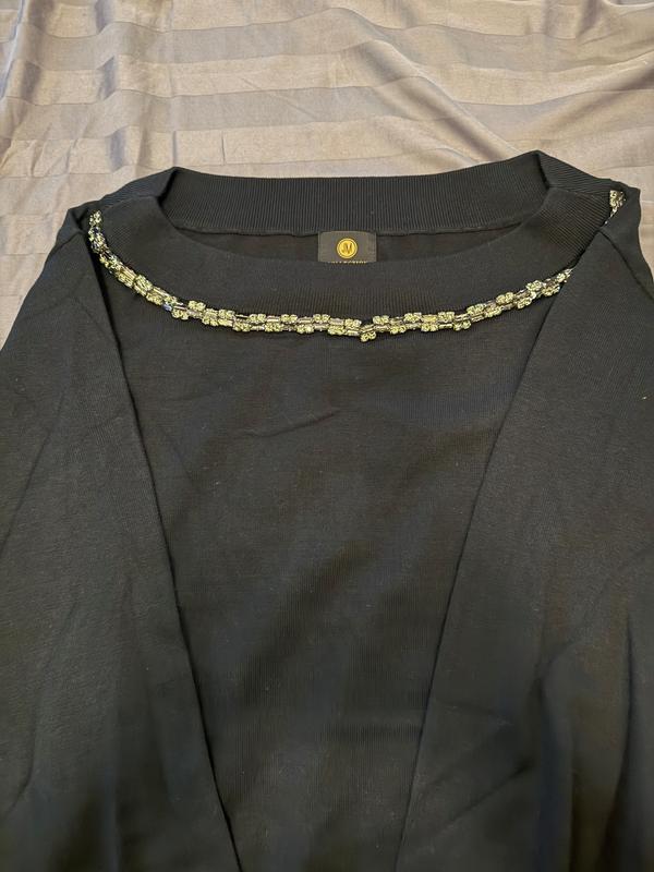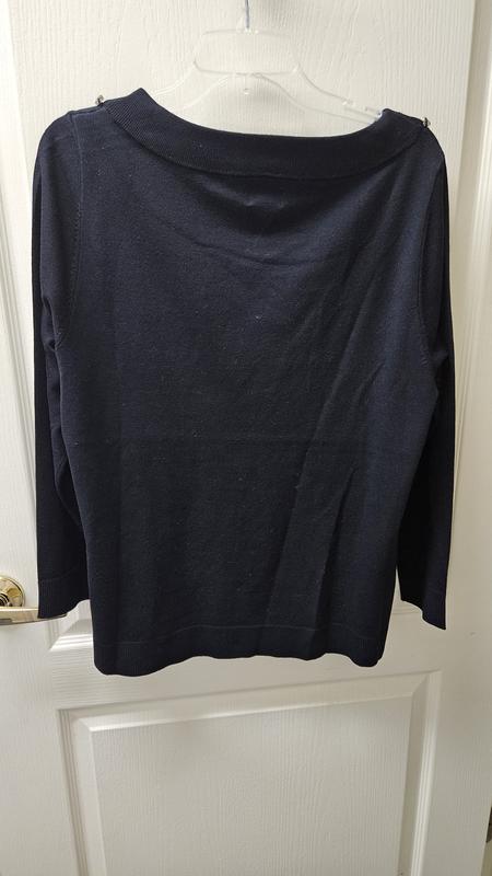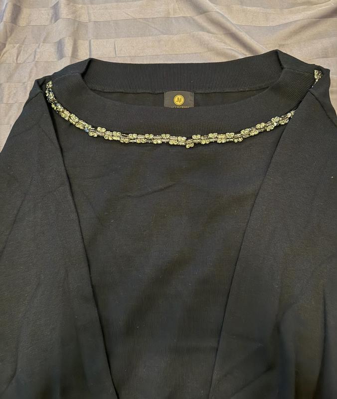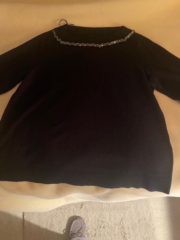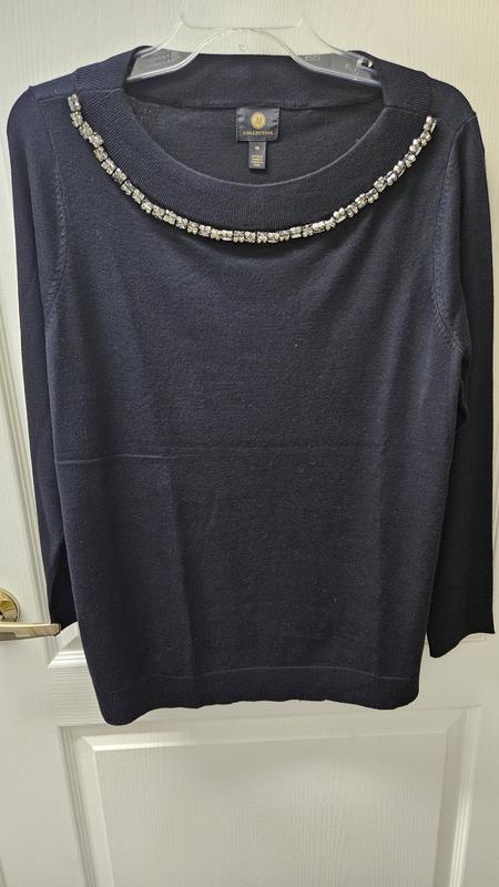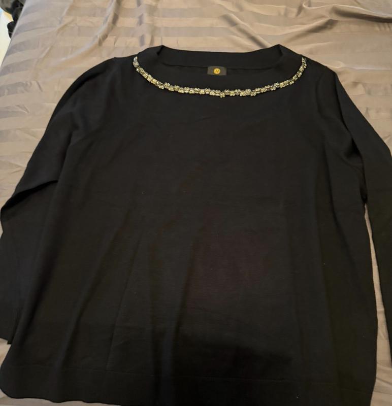 This is beautiful JM collection black boatneck sweater with rhinestone embellishments. The sweater is long sleeved with ribbed cuffs and bottom. The sweater is very soft as it is rayon and polyester and would be great under a blazer or on its own. With the rhinestone neckline, no necklace is needed and can be part of a very dressy outfit or on its own with black jeans. This size ran a tiny bit big, but I would not size down. Easy care, simple turn inside out and wash on gentle with like colors and reshape to dry flat. I did need a cool iron to smooth out a few wrinkles.
